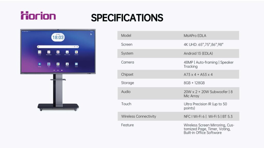 HORION M6APRO 65″ Video conferencing Interactive Flat Panel Display with Built in 48mp 4K UHD webcam with AUTO TRACKING and 8 point array microphone