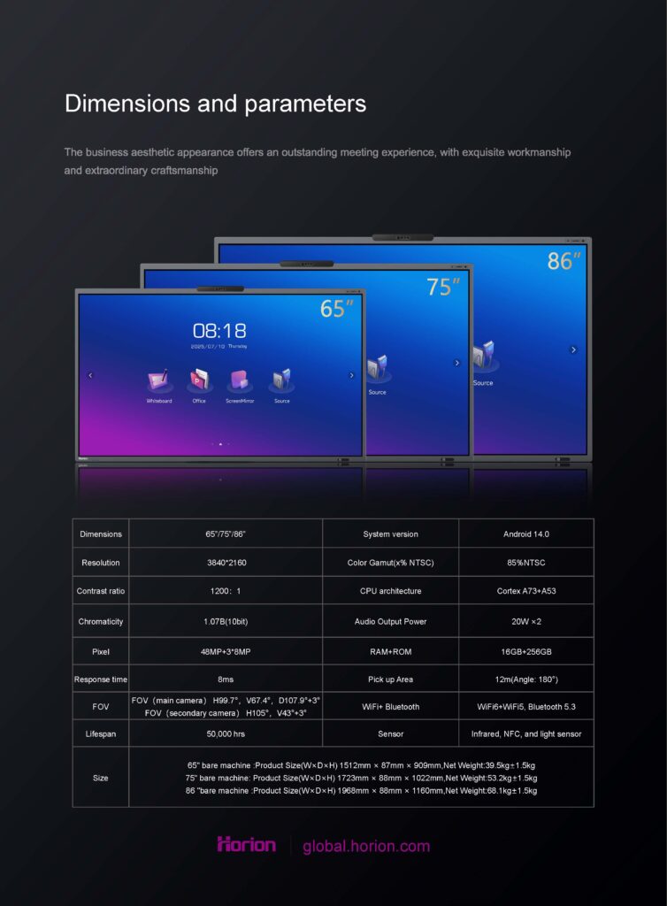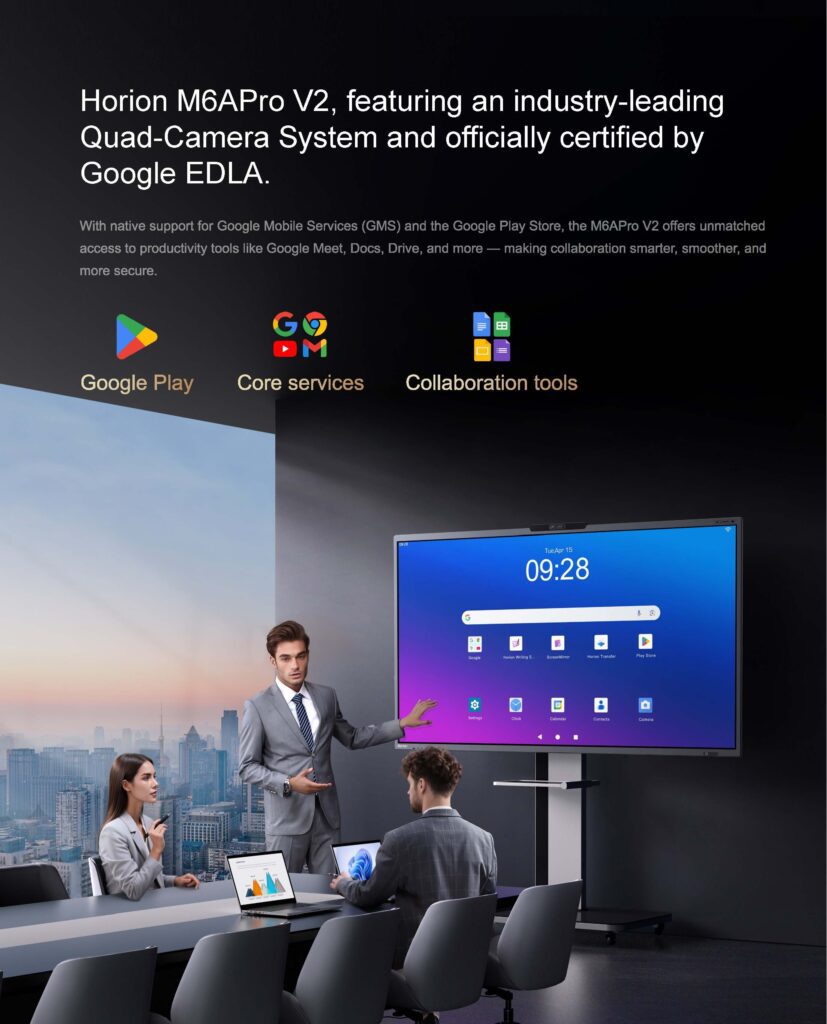 HORION M6APROV2 86″ Video conferencing Interactive Flat Panel Display with Built in 48mp 4K UHD webcam with AUTO TRACKING and 8 point array microphone Android 14, GOOGLE EDLA Certified