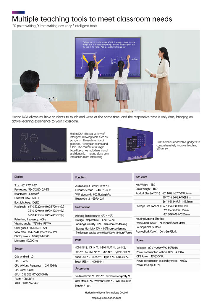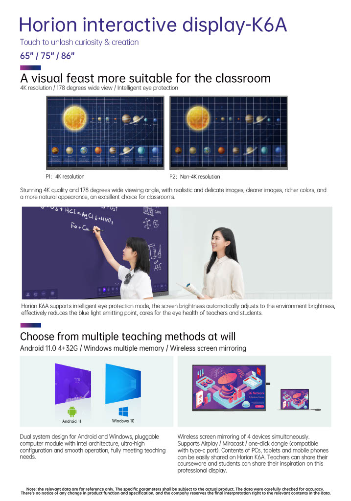 Meet our 65" 4K | 75" 4K | 86" 4K -inch K6A model, a rich configuration that makes classrooms more engaging and efficient.